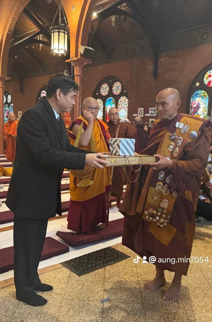 Chargé d’Affaires/ Ambassador of the Republic of the Union of Myanmar to the United States paid homage to “Walk for Peace” monks who made a lunch stop St. Mark’s Capitol Hill Church in Washington, D.C., on 11 February 2026, and offered robes and cash to “Walk for Peace” lead monk Venerable Bhikkhu Paññākāra, aiming for peace and prosperity of Myanmar and its people.
