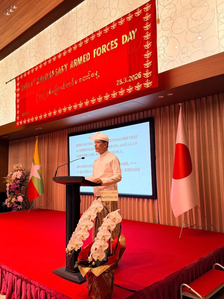 ပြည်ထောင်စုသမ္မတမြန်မာနိုင်ငံတော်၏(၈၁)နှစ်မြောက်တပ်မတော်နေ့အထိမ်းအမှတ် ဧည့်ခံပွဲအခမ်းအနားကို ၂၅-၃-၂၀၂၆ ရက်(ဗုဒ္ဓဟူးနေ့)(၁၁:၀၀) နာရီတွင် မြန်မာသံရုံး၊ တိုကျိုမြို့ ရှိ ဧရာဝတီခန်းမ၌ ကျင်းပပြုလုပ်ခဲ့ပါသည်။
